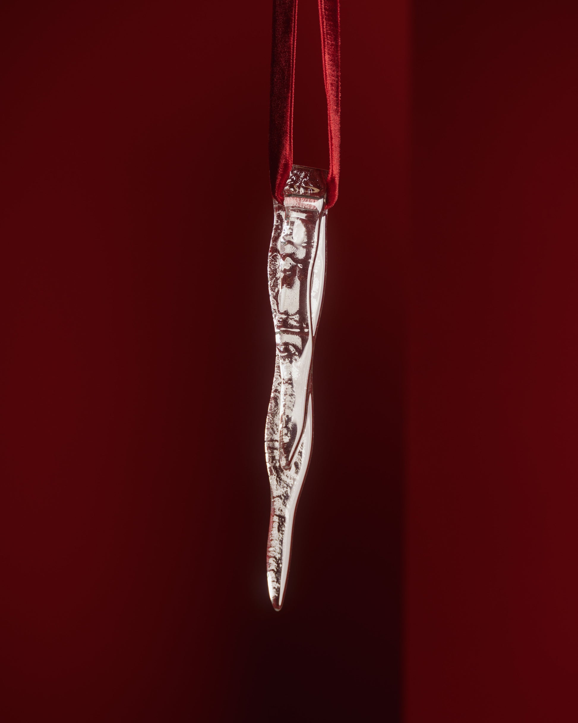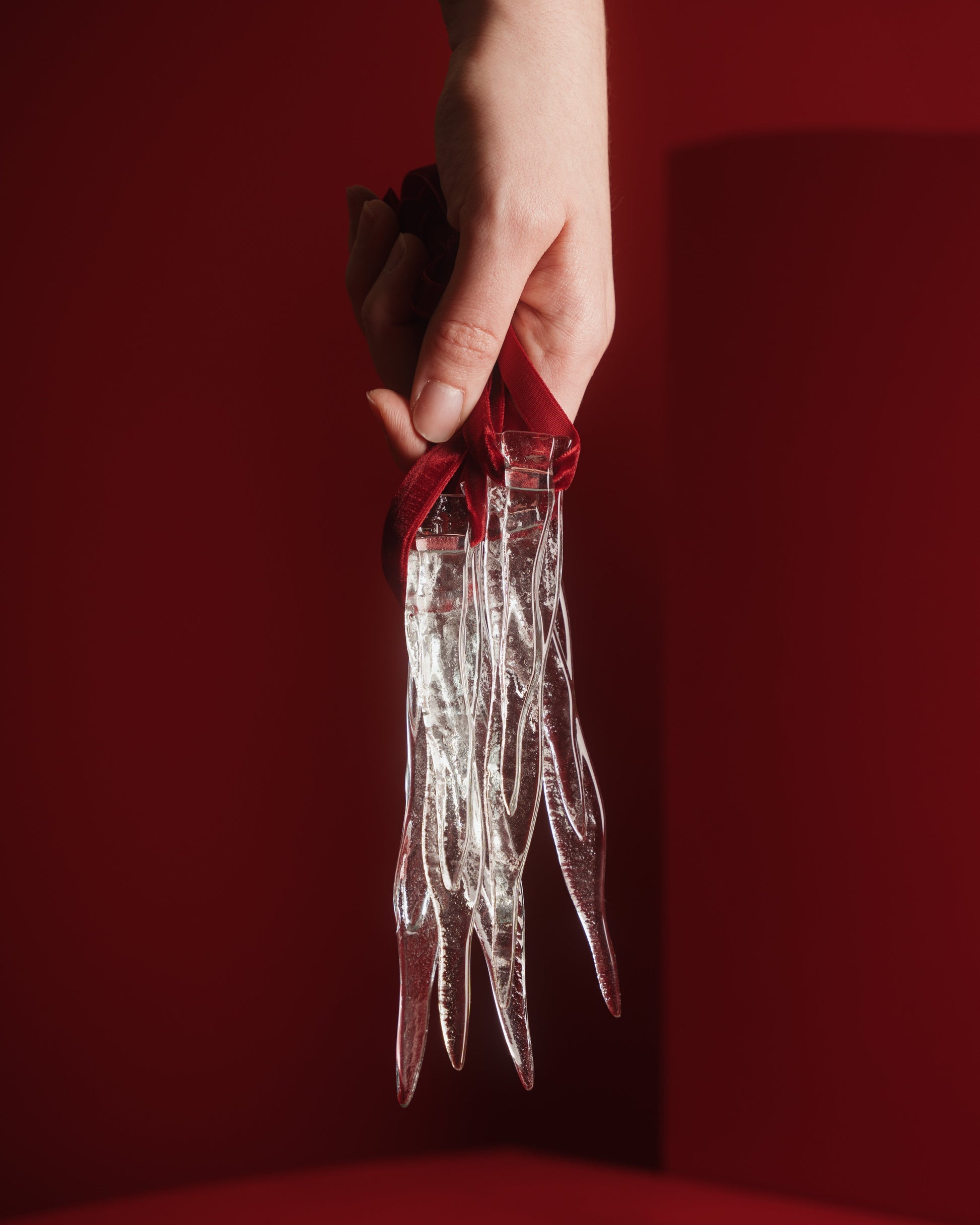 Stakleni set božićnih ukrasa "Sige" izrađen je tehnikom staklene fuzije od bezbojnog stakla.